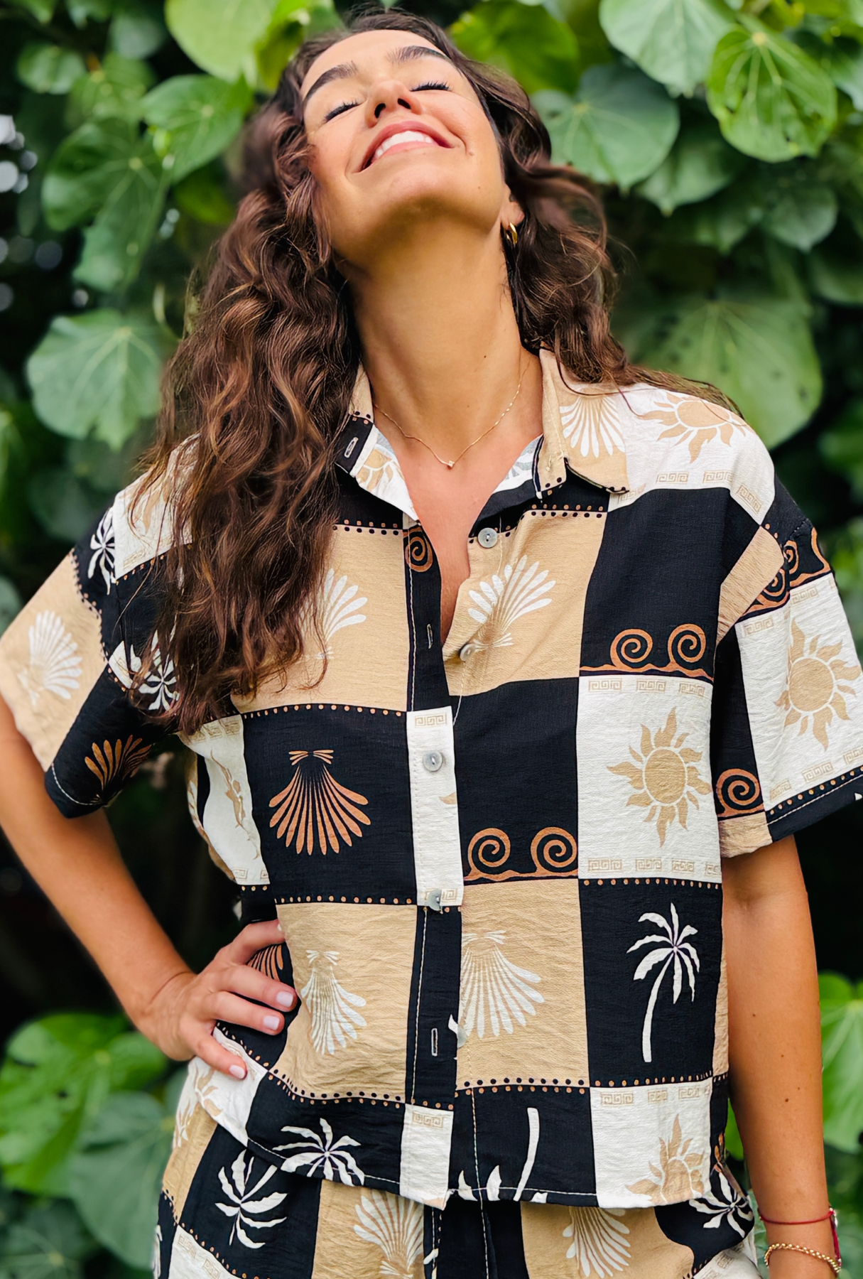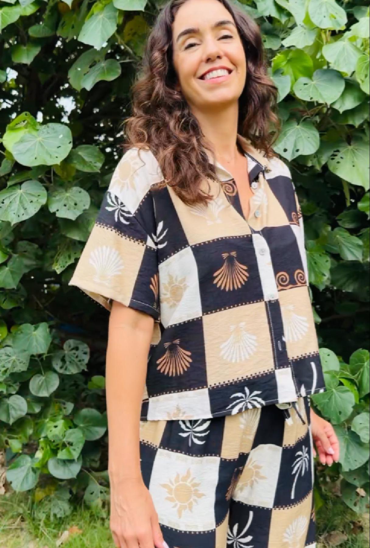 The Check Me Out Top combines relaxed tailoring with a striking patchwork print inspired by the sun, sea, and travel. Made in Italy from lightweight, breathable fabric, it drapes beautifully on the body while maintaining a soft, easy shape that remains comfortable throughout the day.