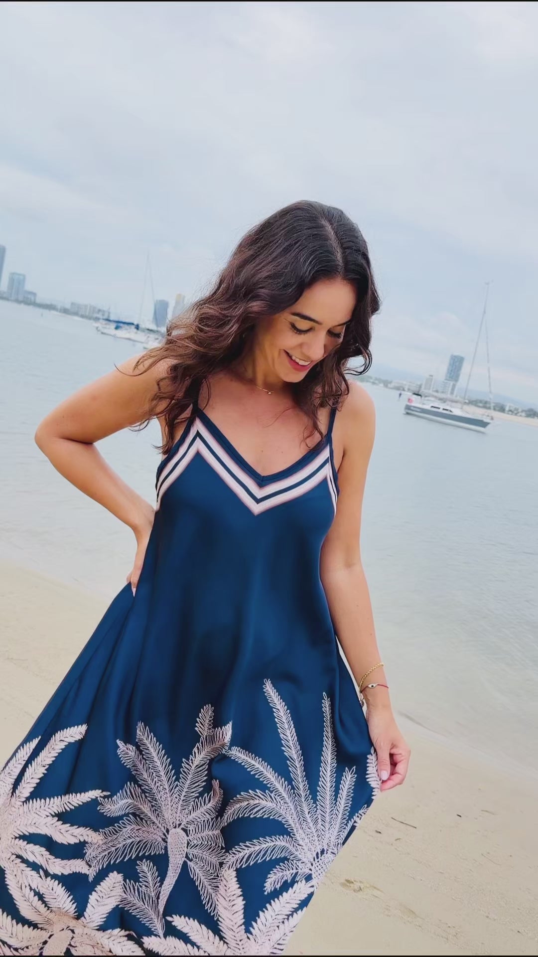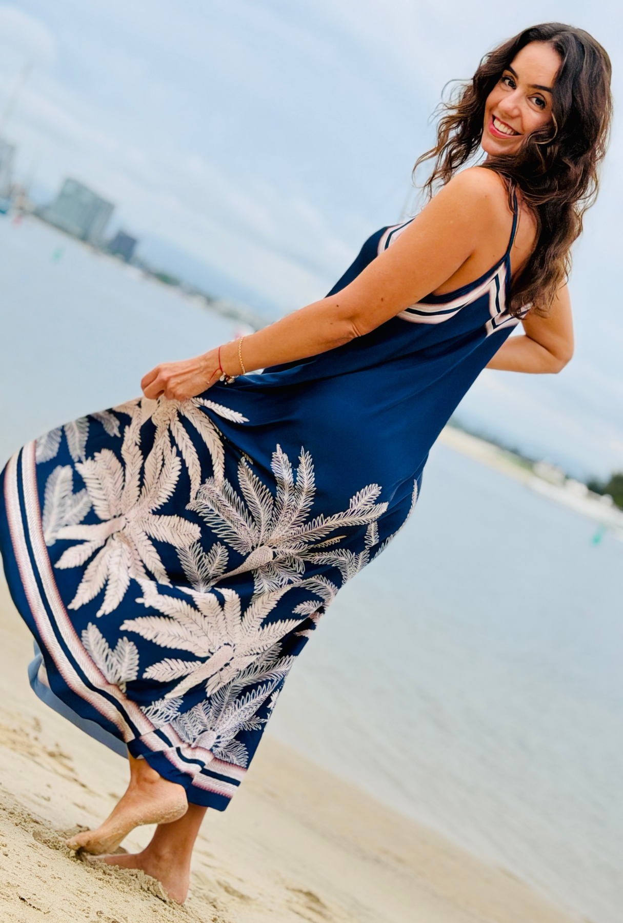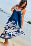 Featuring delicate shoulder straps, a relaxed silhouette and a statement palm motif through the hem, this dress flatters without clinging and allows natural movement with every step. The contrast border detailing adds a polished finish, elevating the overall look while keeping it easy to wear.