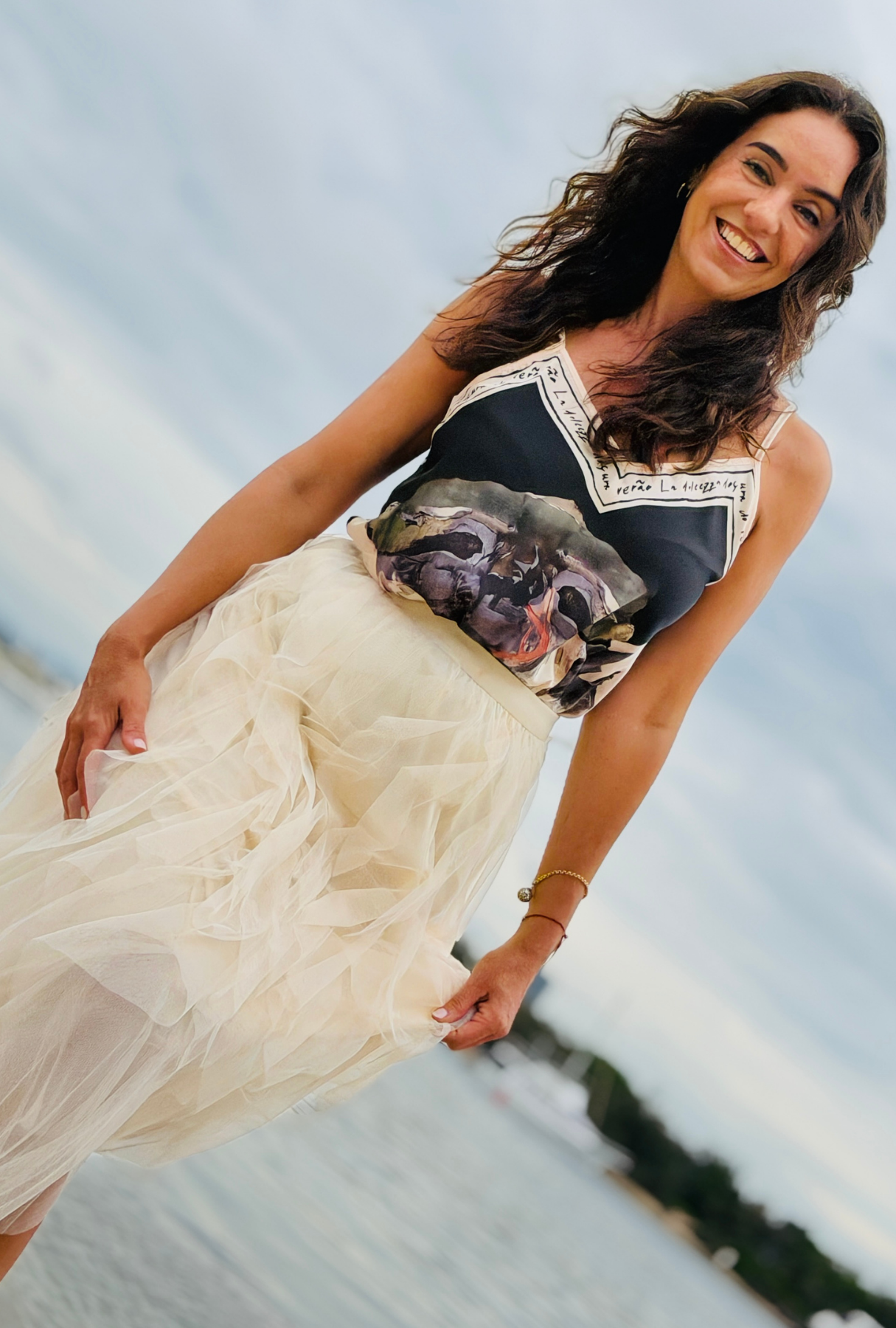 The Pretty In Paint Top is a standout piece with an artistic, hand-painted feel that brings colour and individuality to any outfit. Made in Italy from a luxe fabric blend with a soft silk touch, it has a fluid drape that feels light on the body while still offering a refined finish.