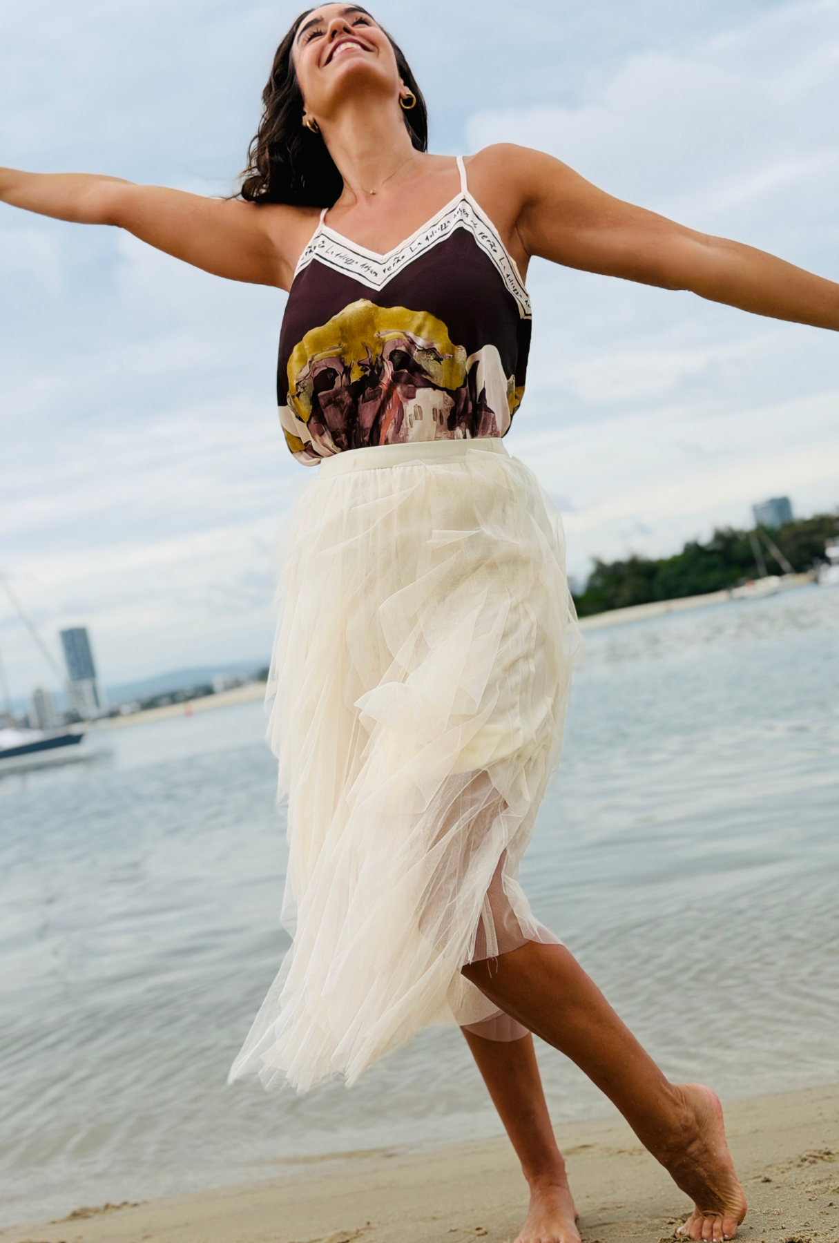 Designed with delicate straps and a relaxed silhouette, this top falls effortlessly without clinging, making it both flattering and easy to wear. The contrast neckline detail adds definition, while the abstract print ensures every colourway feels unique in its own way.