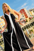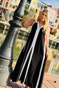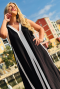 Designed to flatter and flow, this striking dress brings a modern edge to effortless style. Crafted in Italy, the contrasting stripe detail elongates the silhouette and adds graceful movement with every step. The relaxed fit and deep V neckline create an elegant yet easy-to-wear look that transitions beautifully from day to night.