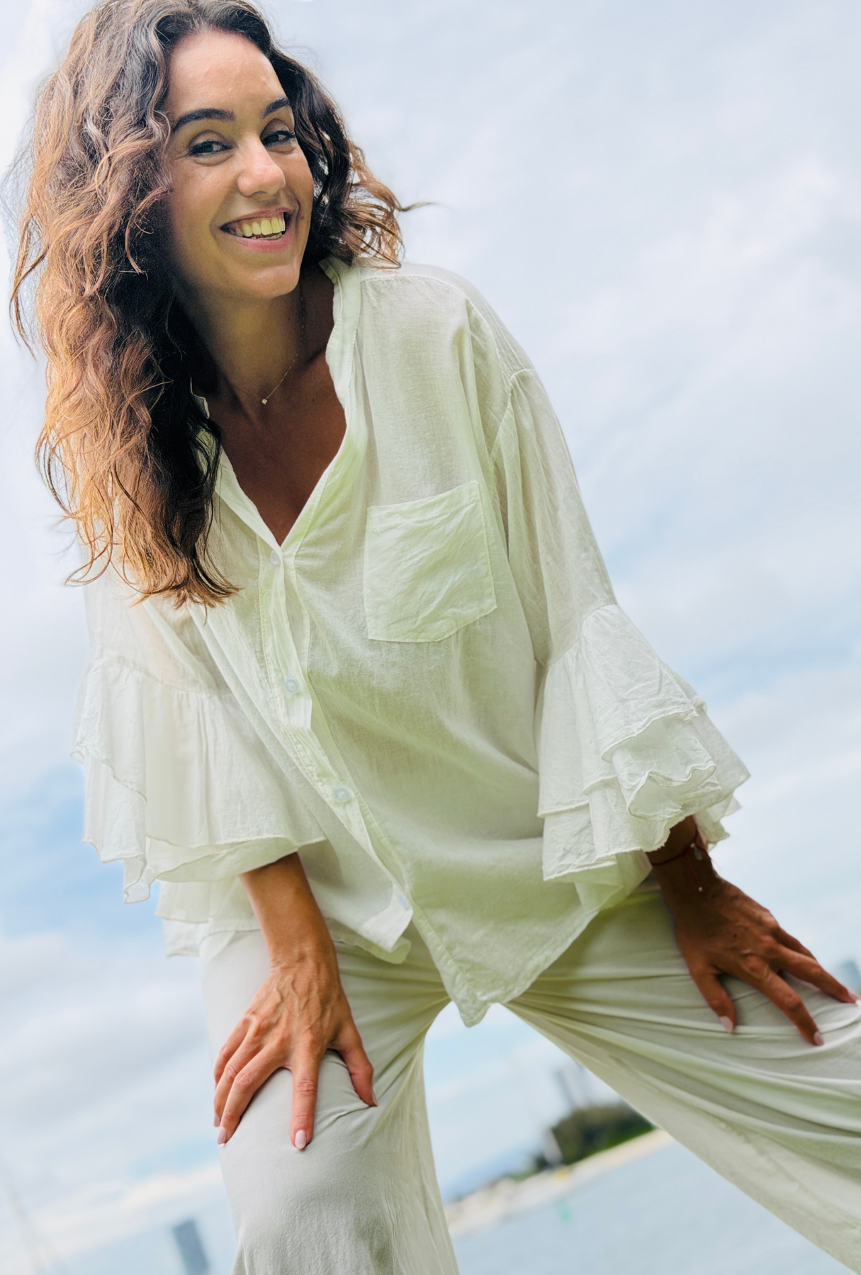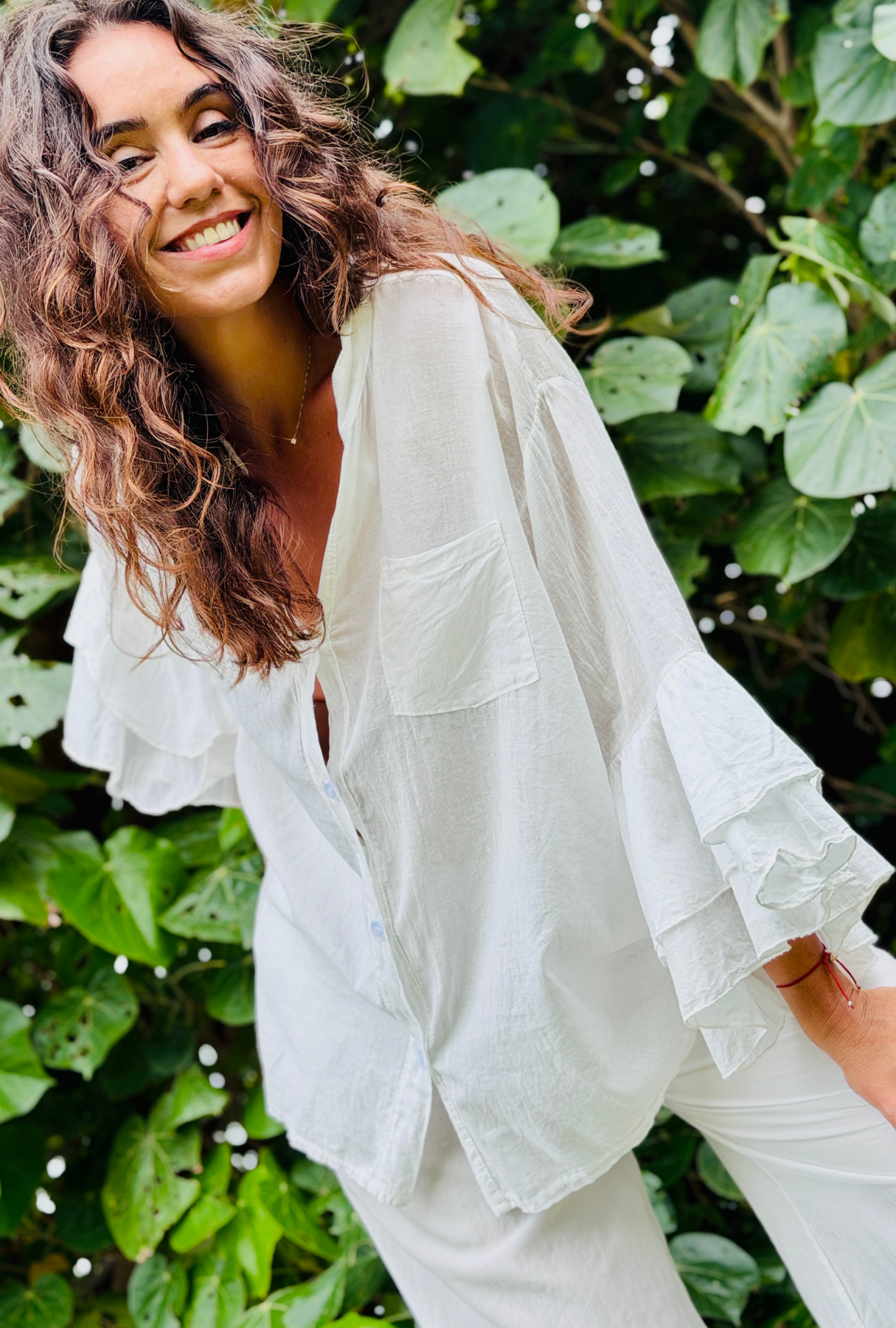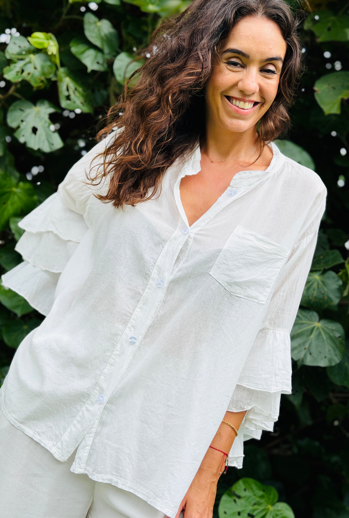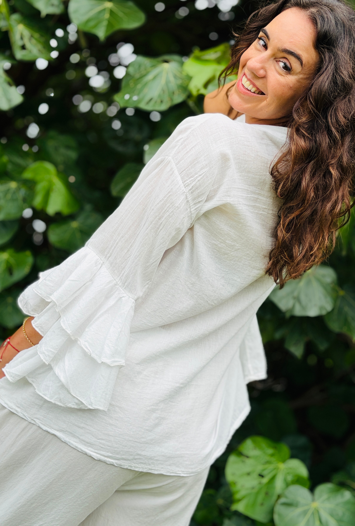 A statement in softness and style. Crafted from the finest 100% cotton and proudly Made in Italy, this dreamy top features cascading triple‑layer frill sleeves and a versatile front that can be worn open or tied. Light, airy, and effortlessly chic, it’s available in a stunning array of colours to suit every mood. Perfect for dressing up or adding drama to your everyday look.